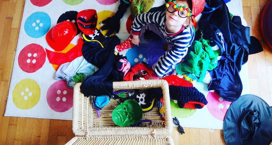Una vecchia parrucca di carnevale, un mantello, una camicia da notte, un cappello, un paio di occhiali: pescate insieme da lì dentro, e inventa per il bambino delle storie di cui tu e lui siete i protagonisti.