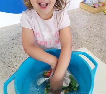 In una aggiungete un po’ di sapone neutro e… immergete, uno alla volta i vestitini o le stoffe che avete deciso di lavare. Strofinate ben bene più e più volte.